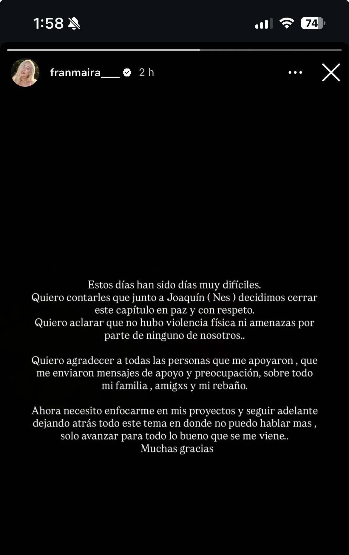 "Estos días han sido días muy difíciles. Quiero contarles que junto a Joaquín (Nes) decidimos cerrar este capítulo en paz y con respeto", comenzó en un texto compartido en Instagram.