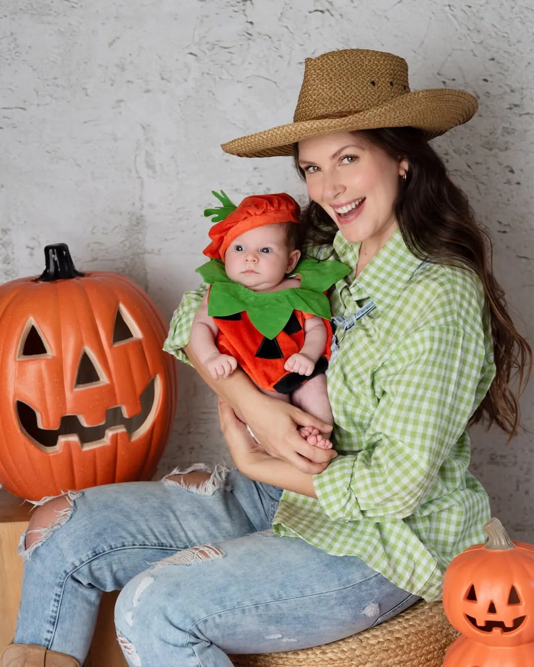 Eugenia Lemos con su bebé como la granjera y su calabaza.