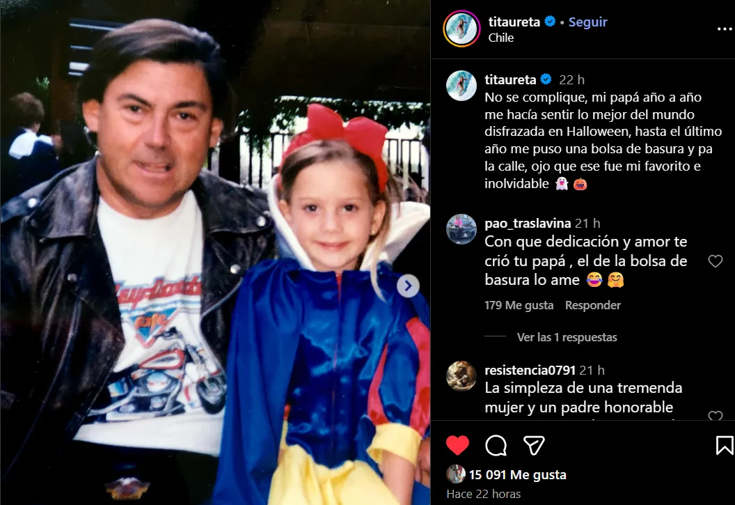 En esa línea, Tita Ureta desclasificó la particular historia detrás de esa foto. "No se complique, mi papá año a año me hacía sentir lo mejor del mundo disfrazada en Halloween", comenzó el relato compartido en Instagram.