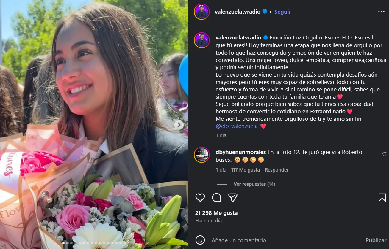 Daniel Valenzuela y Paloma Aliaga celebraron con alegría el logro académico de su hija Eloísa, quien finalizó sus estudios de Enseñanza Media a los 18 años. Valenzuela expresó su emoción y orgullo en redes sociales, destacando las cualidades de su hija y mencionando los desafíos que enfrentará en el futuro. Por su parte, Paloma compartió un emotivo video junto a Elo, mientras recordaba que también tienen otra hija, Alonda, que se encuentra en Canadá perfeccionando sus estudios artísticos.