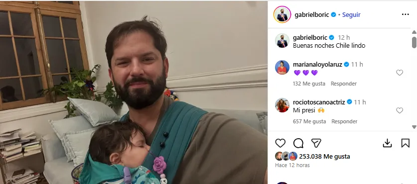 "Buenas noches, Chile lindo", escribió junto a la imagen, donde aparece porteando a su hija.