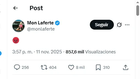 En la misma publicación, una usuaria le preguntó respecto a su tuit anterior: "Ay, ya la íbamos a funar. ¿Por qué estabas enojada hace rato?". A lo que Mon Laferte le respondió: "Jajaja, por el internet lento de mi pueblo".
