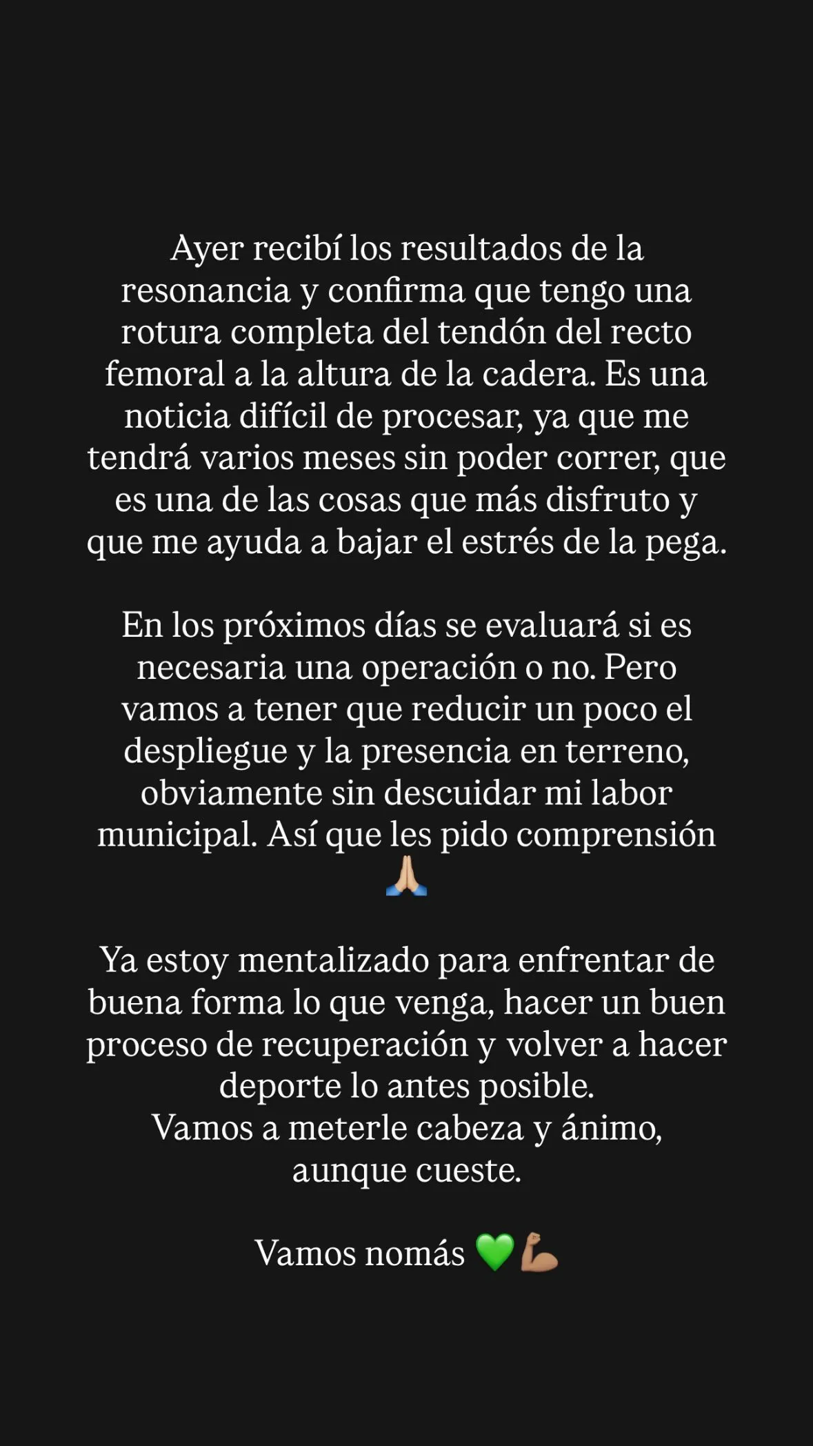Mediante sus historias de Instagram, la autoridad comunal entregó la noticia, y precisó que sufrió una rotura completa del tendón del recto femoral a la altura de la cadera.