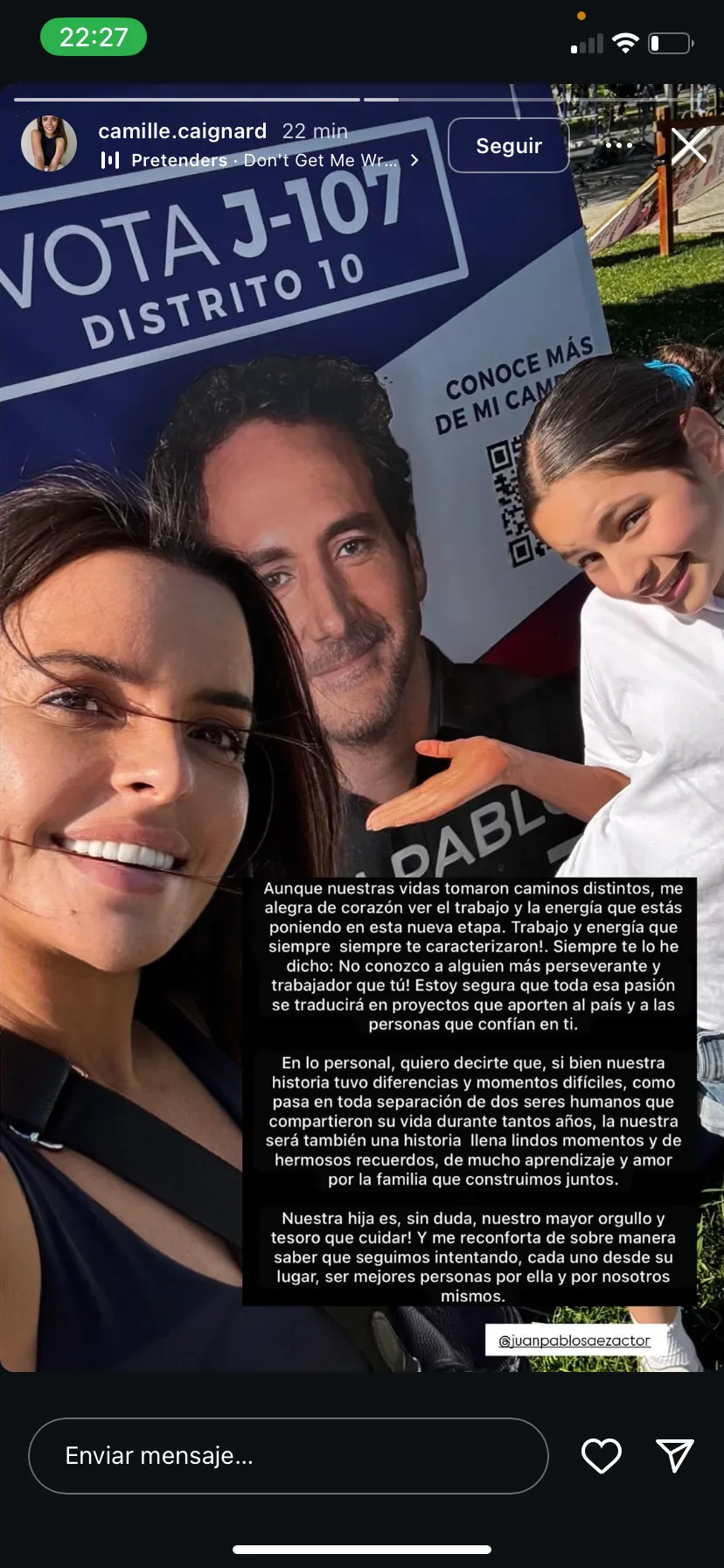 En el cierre de su campaña, Juan Pablo Sáez recibió un mensaje de apoyo sorpresivo de su ex pareja, Camille Caignard, quien previamente lo había denunciado por violencia psicológica. A través de redes sociales, compartió una selfie junto a su hija y el candidato, elogiando su trabajo y energía. Este gesto fue considerado un acto de madurez y afecto por su círculo cercano. Sáez, absuelto de la acusación, se muestra concentrado en su carrera artística y propuestas políticas, compitiendo por un escaño como diputado en el Distrito 10 de Santiago.