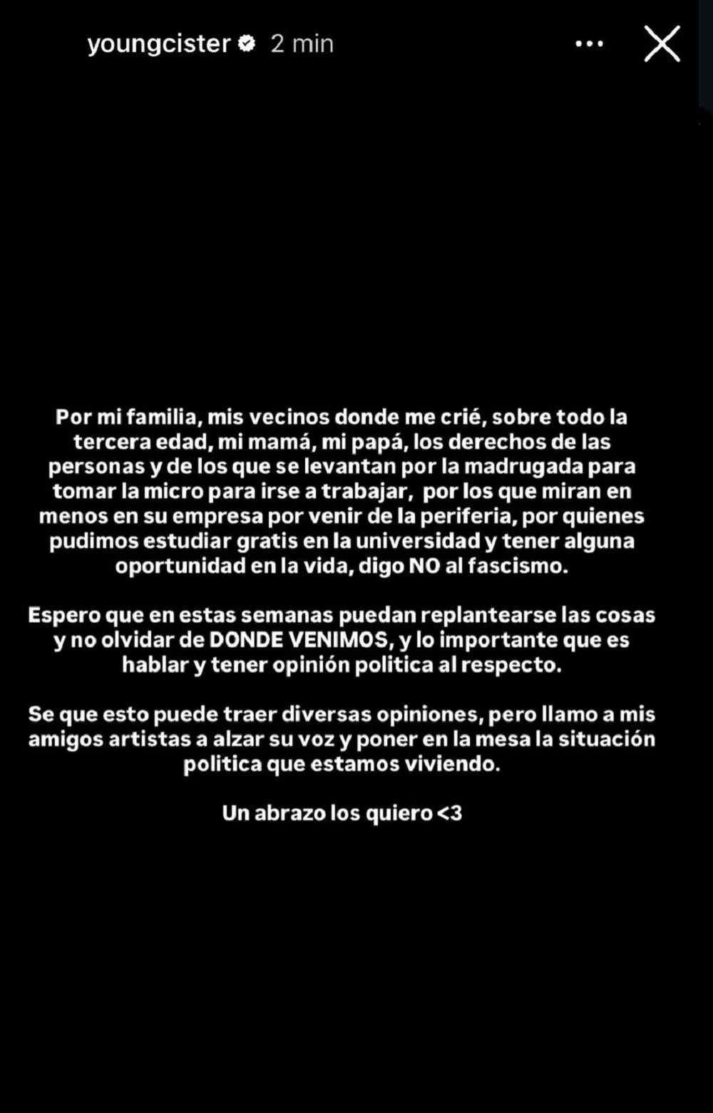 A través de redes sociales, Young Cister compartió un potente mensaje luego de que se conocieran los resultados de la primera vuelta en estas elecciones presidenciales.