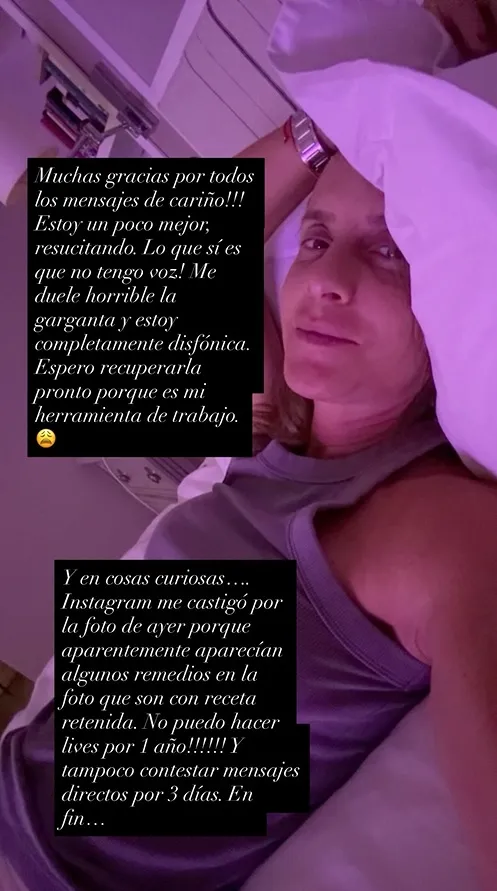 “En cosas curiosas… Instagram me castigó por la foto de ayer, porque aparentemente aparecían algunos remedios en la foto que son con receta retenida. ¡No puedo hacer lives por un año! Y tampoco contestar mensajes directos por tres días”, escribió.