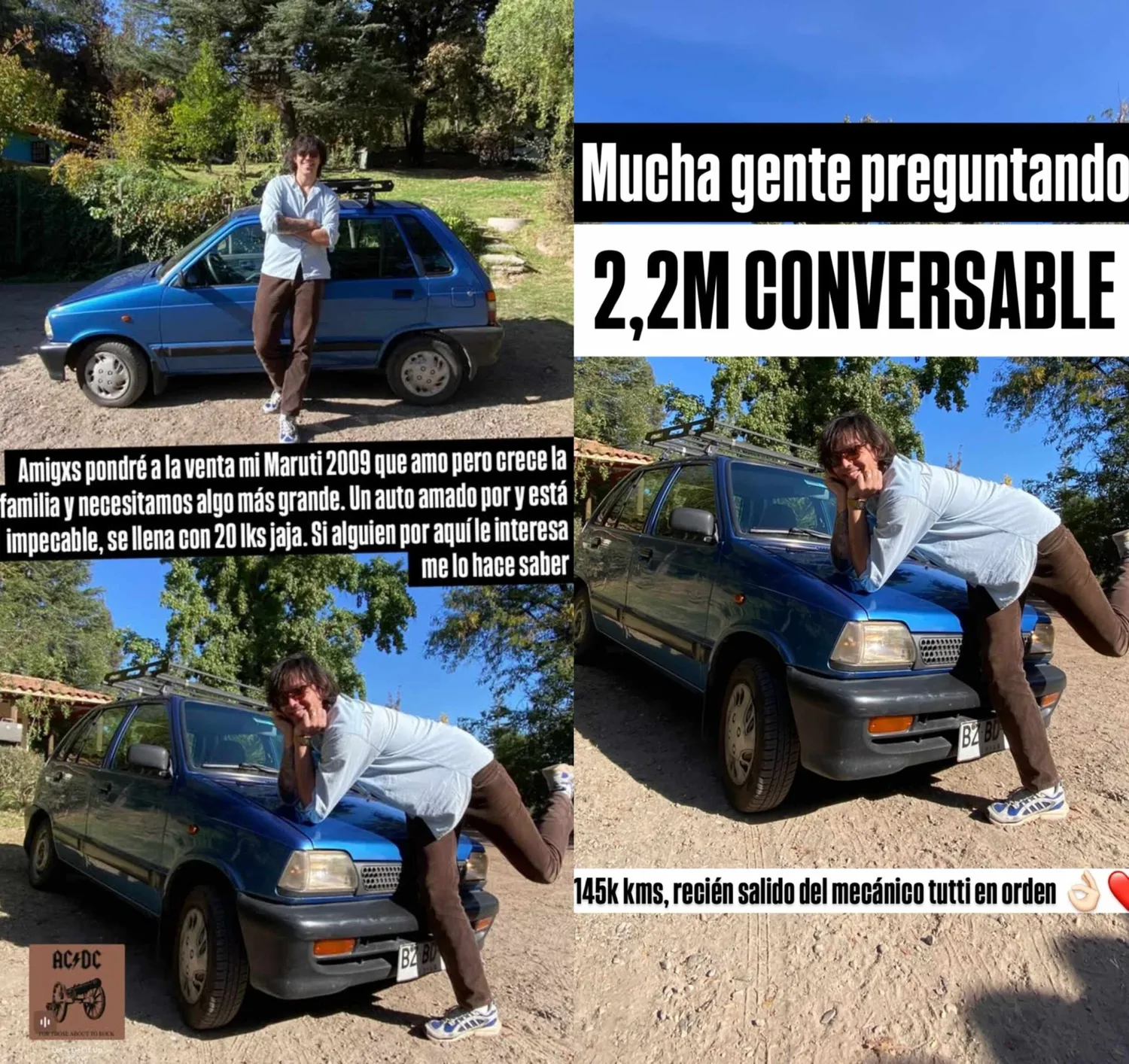 El músico, exintegrante de Moral Distraída y actual miembro de Plumas, anunció una decisión nada menor en medio de la dulce espera de su primer hijo junto a la actriz Daniela Pérez: puso a la venta su preciado automóvil, un Suzuki Maruti 2009 que —según él mismo ha dicho— “ama”.