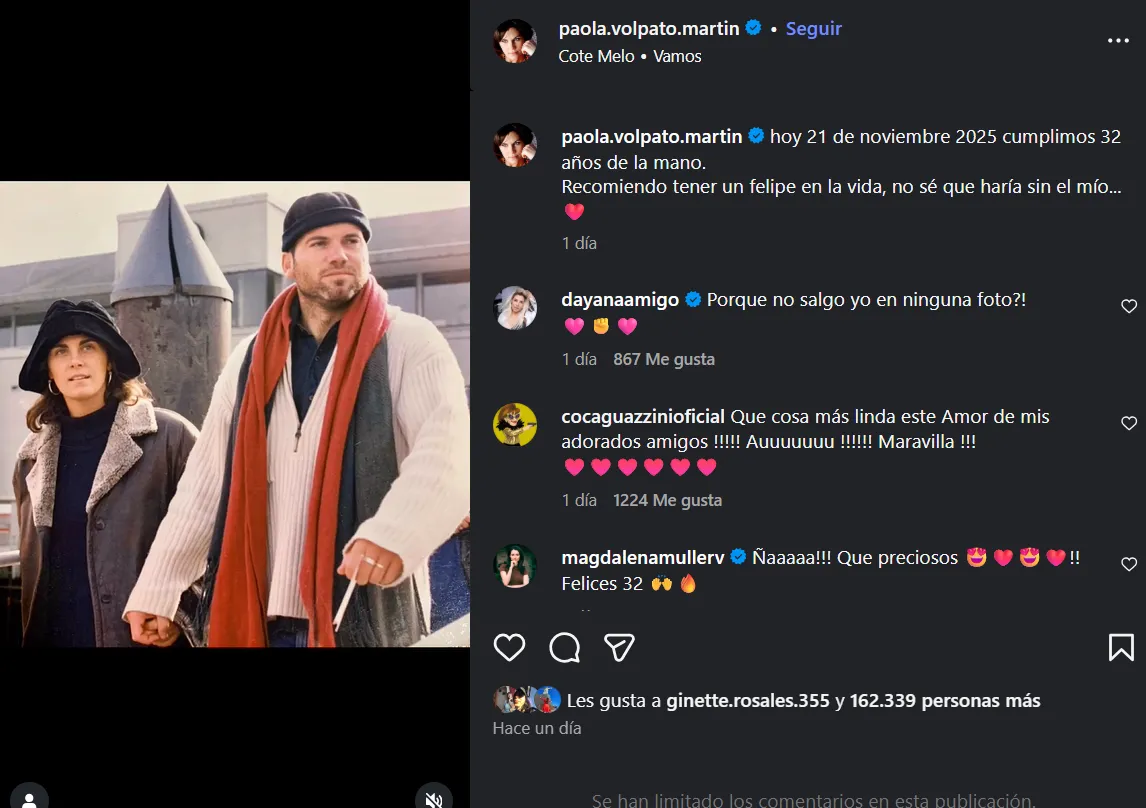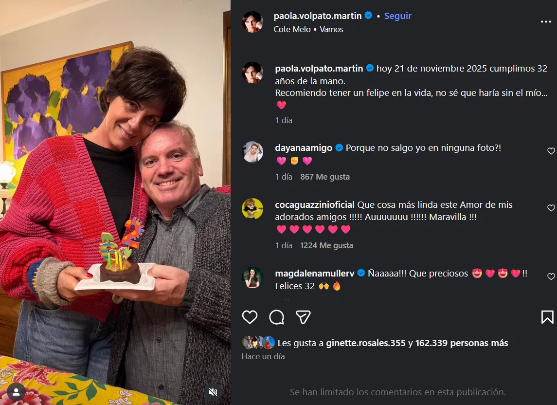 "¡Qué cosa más linda este amor de mis adorados amigos!", escribió Coca Guazzini. "¡Qué preciosos! Felices 32", añadió Magdalena Müller. "Gran hazaña", se sumó María Omegna.