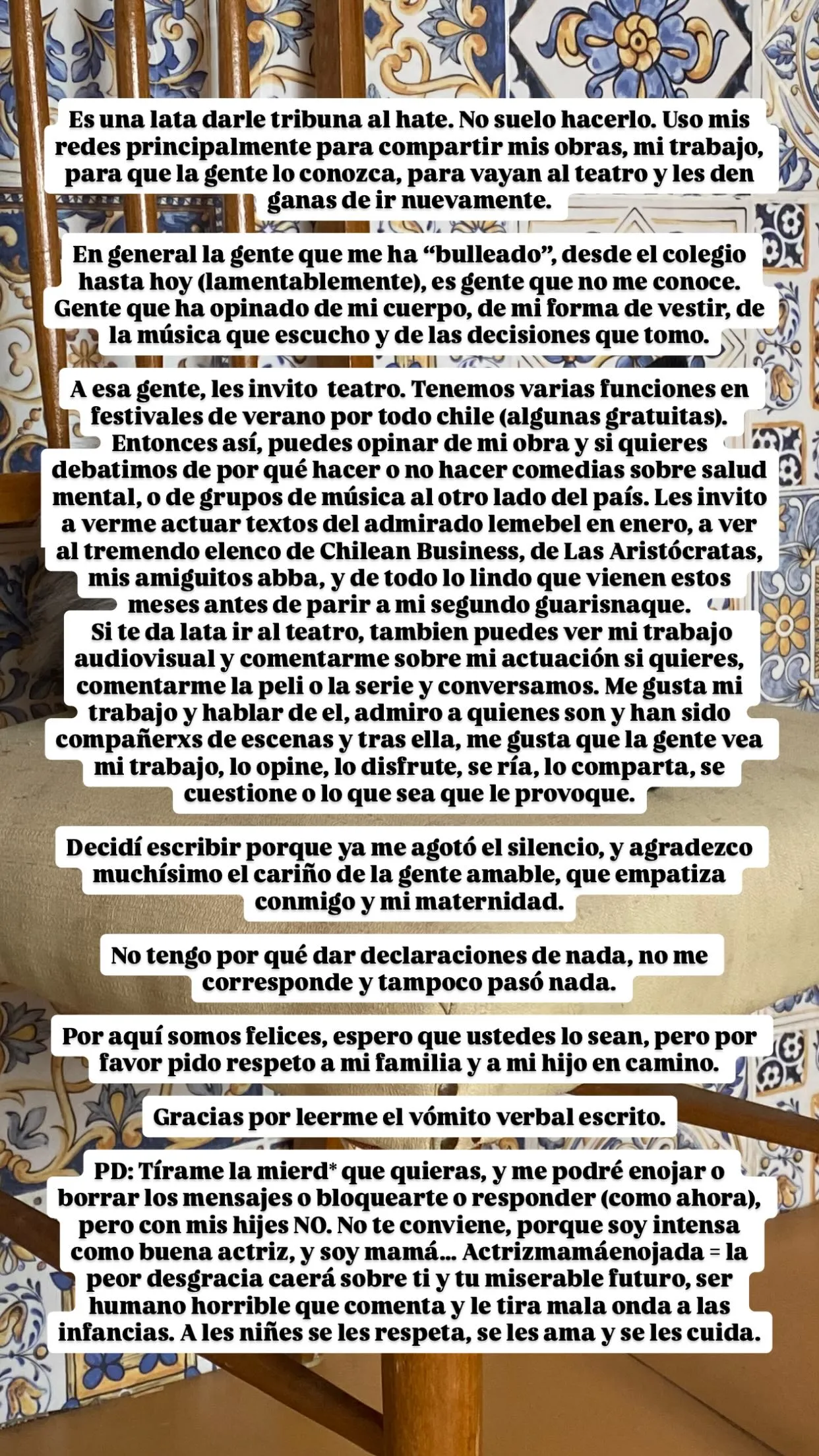 "Decidí escribir porque ya me agotó el silencio, y agradezco muchísimo el cariño de la gente amable, que empatiza conmigo y mi maternidad. No tengo por qué dar declaraciones de nada, no me corresponde y tampoco pasó nada", recalcó.