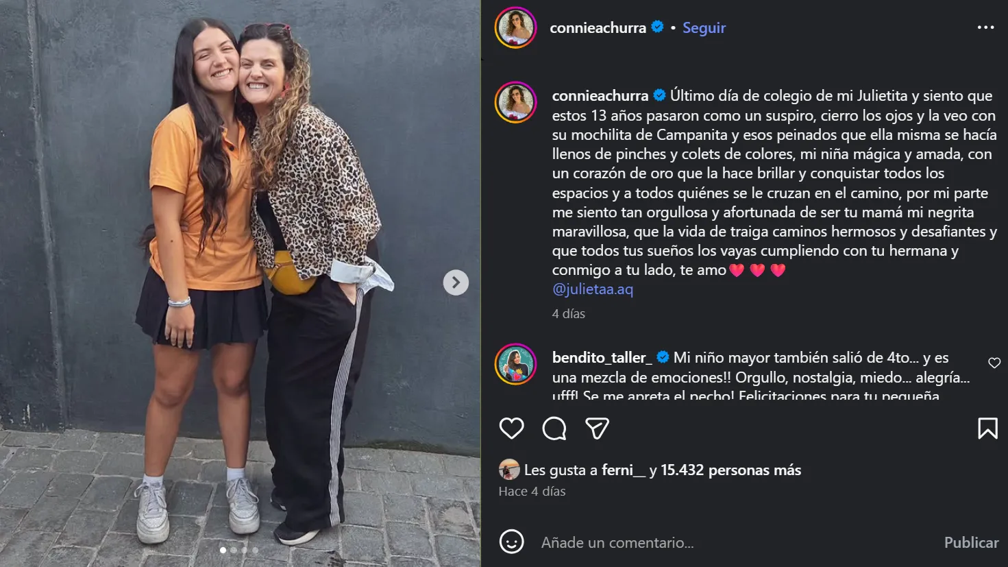 La reconocida cocinera e influencer Connie Achurra emocionó a sus seguidores al compartir el último día de clases de su hija Julieta, quien cerró oficialmente su etapa escolar a los 17 años. En su publicación de Instagram, Achurra recordó con nostalgia los 13 años de colegio de su hija, destacando su amor y admiración hacia ella. La publicación generó gran identificación entre los seguidores, quienes expresaron sus mensajes de apoyo y cariño. Cabe destacar que Julieta es hija de Achurra y el fallecido productor de Rojo Claudio Carrizo.