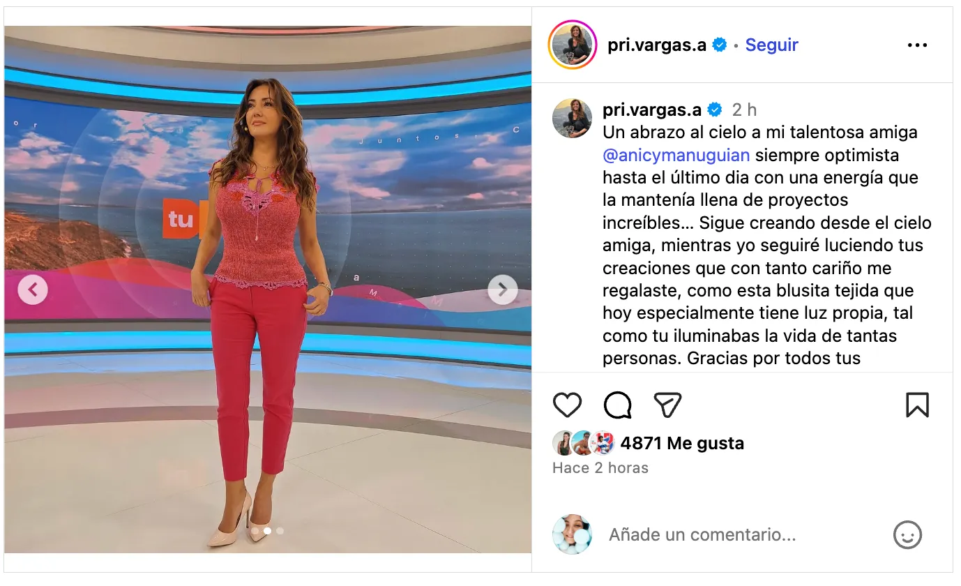 “Un abrazo al cielo a mi talentosa amiga @anicymanuguian. Siempre optimista hasta el último día, con una energía que la mantenía llena de proyectos increíbles”, expresó Vargas en su cuenta de Instagram, acompañando sus palabras con un conjunto de fotografías donde se le ve luciendo una de las piezas de la diseñadora.