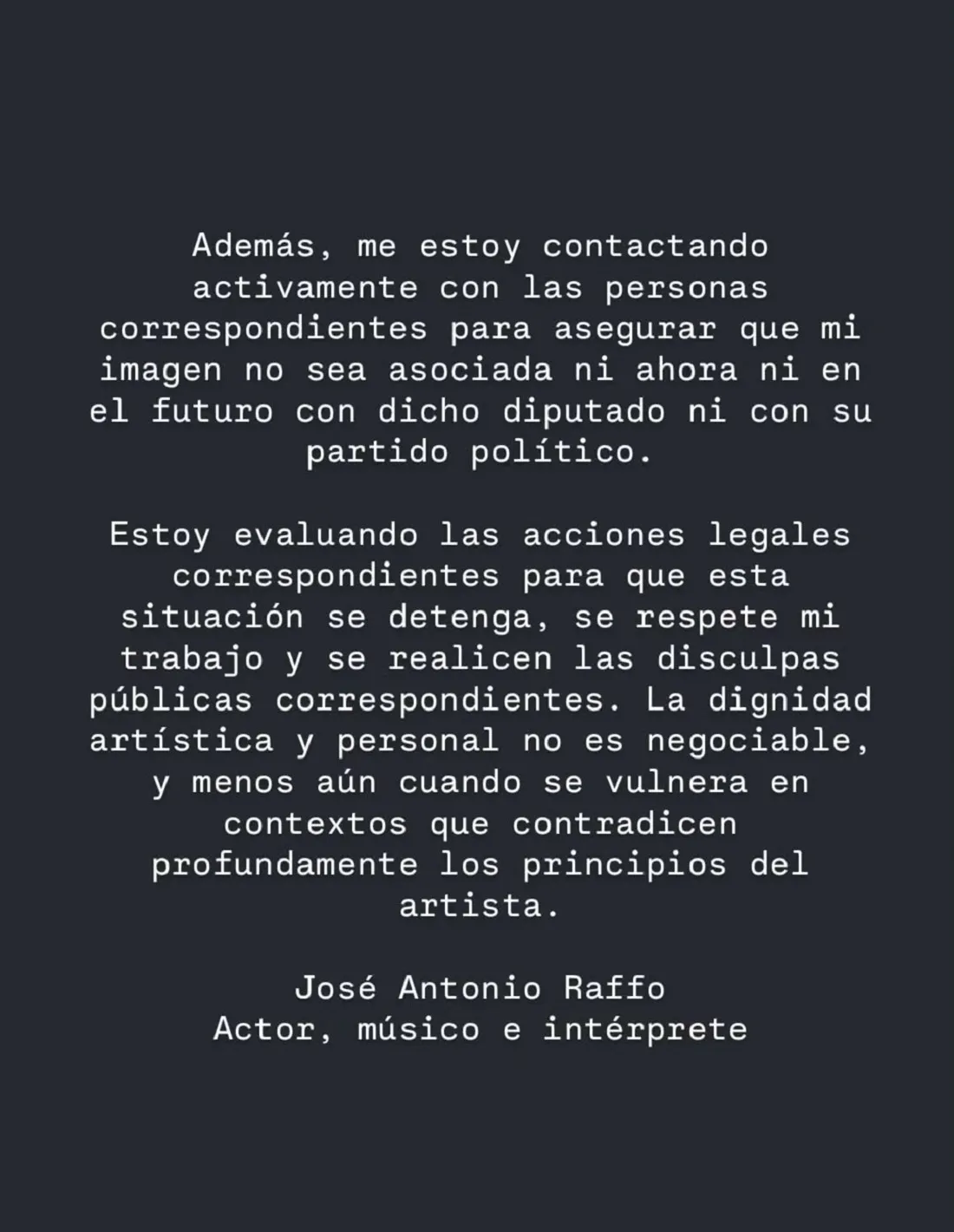 Más allá de las explicaciones de Meza, José Antonio Raffo subrayó que la canción fue utilizada sin su "autorización, consentimiento ni conocimiento previo", dejando en claro que no existe ningún vínculo "contractual, colaborativo ni de simpatía" entre él y el diputado, ni con el Partido Republicano.