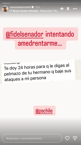 El ex periodista Marcelo Arismendi lanzó un duro mensaje a través de su cuenta de Instagram contra el senador Fidel Espinoza, acusándolo de amenazar a uno de sus hermanos. Arismendi instó al parlamentario a moderar sus acciones y lo advirtió sobre las consecuencias de sus supuestas amenazas. El ex integrante de CQC y Espías del amor de CHV afirmó que estará atento a las acciones del senador y se comprometió a denunciar públicamente cualquier intento de intimidación hacia su familia.