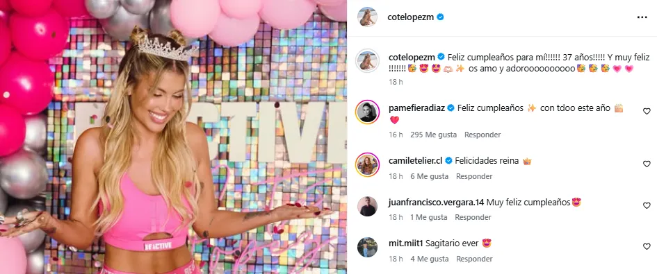 La empresaria Coté López celebró su cumpleaños número 37 compartiendo una foto en redes sociales luciendo un conjunto de Be Active y una torta rosada. En este nuevo año de vida, Coté se encuentra en una relación con el influencer Lucas Lama, quien le regaló un tatuaje con su nombre. Ambos expresaron su amor y felicitaciones a través de Instagram, mostrando su feliz momento en pareja.
