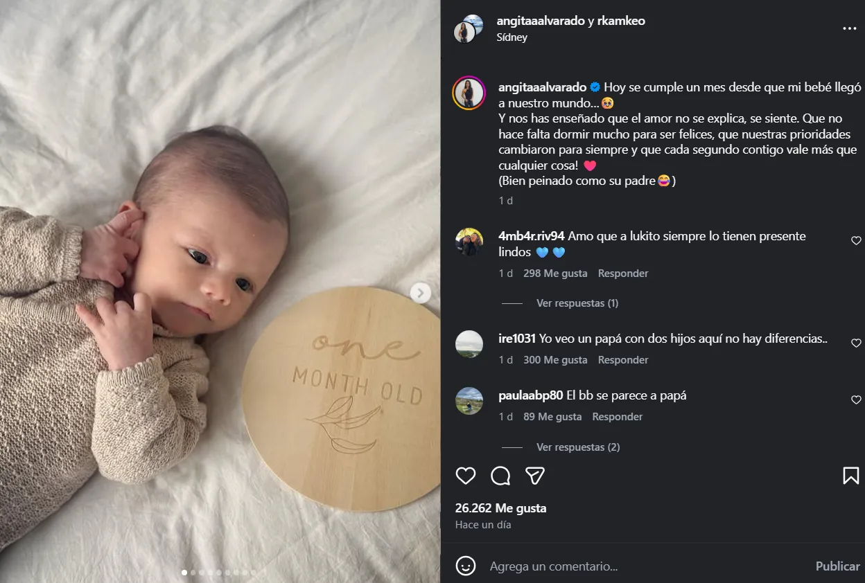 La hija de Anita Alvarado, Angie Alvarado, y el empresario Rodolfo Kamke celebraron el primer mes de su bebé, Rodolfo, compartiendo fotos en Instagram. En el mensaje, Angie expresó su amor por su hijo y la felicidad a pesar del cansancio de la maternidad. Destacó que su hijo heredó el nombre de su padre y que ha sido fotografiado "bien peinado". A pesar de la alegría, Angie también ha compartido los desafíos que enfrentó al inicio con la lactancia materna. La pareja se casó en junio de 2023 en Sidney, Australia.