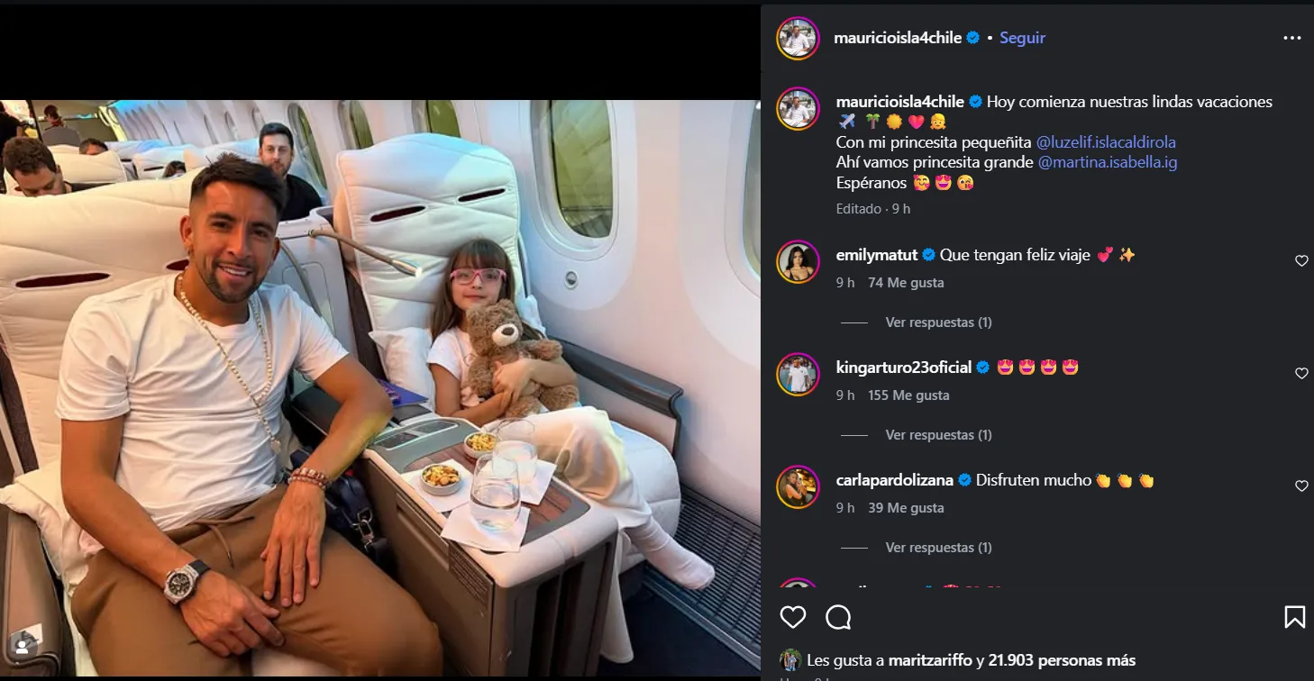 Mauricio "Huaso" Isla inició un viaje familiar junto a su hija menor, Luz Elif, para reunirse con su hija mayor, Martina Isabella. El futbolista compartió la noticia en redes sociales y publicó una foto junto a Martina. Su pareja, Emily Natut, le deseó un buen viaje en los comentarios, y Arturo Vidal también envió buenos deseos. Martina es fruto de una relación anterior, mientras que Luz Elif es hija de su matrimonio con Gala Caldirola.