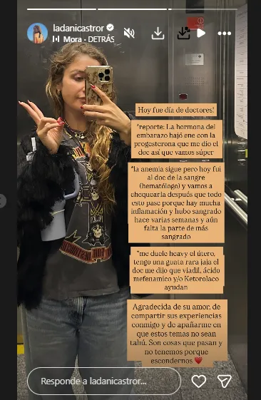 La influencer Daniela Castro actualizó a sus seguidores sobre su estado de salud tras sufrir un aborto espontáneo durante un ensayo para Fiebre de Baile. Tras ser trasladada de urgencia a un centro asistencial, reveló que su embarazo fue interrumpido y debió abandonar el programa de Chilevisión. En una reciente publicación, Castro informó que sigue con anemia y dolores en el útero, pero se mostró agradecida por el apoyo de sus seguidores y abogó por no ocultar temas como este, que considera que no deberían ser tabú.