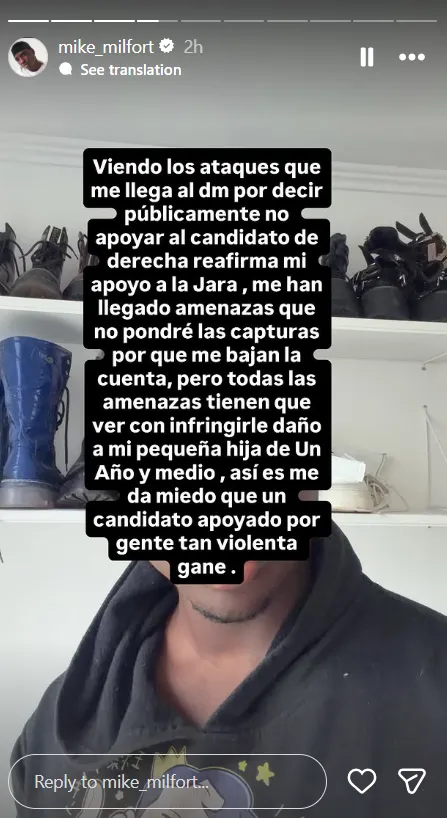 El popular influencer Mike Milfort denunció amenazas contra su hija tras expresar su apoyo a Jeannette Jara en la segunda vuelta presidencial. Afirmó que los ataques fortalecieron su postura política. Decidió no exponer los perfiles de los acosadores para evitar más hostigamiento. Llamó a no desear un mal gobierno, destacando la importancia de la responsabilidad en redes sociales.