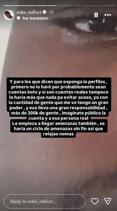 “Yo con la cantidad de gente que me ve tengo un gran poder, y eso lleva una gran responsabilidad, más de 300 mil personas. Imagínate publico la cuenta y a esa persona real le empiezan a llegar amenazas también, se haría un ciclo de amenazas sin fin”, explicó.