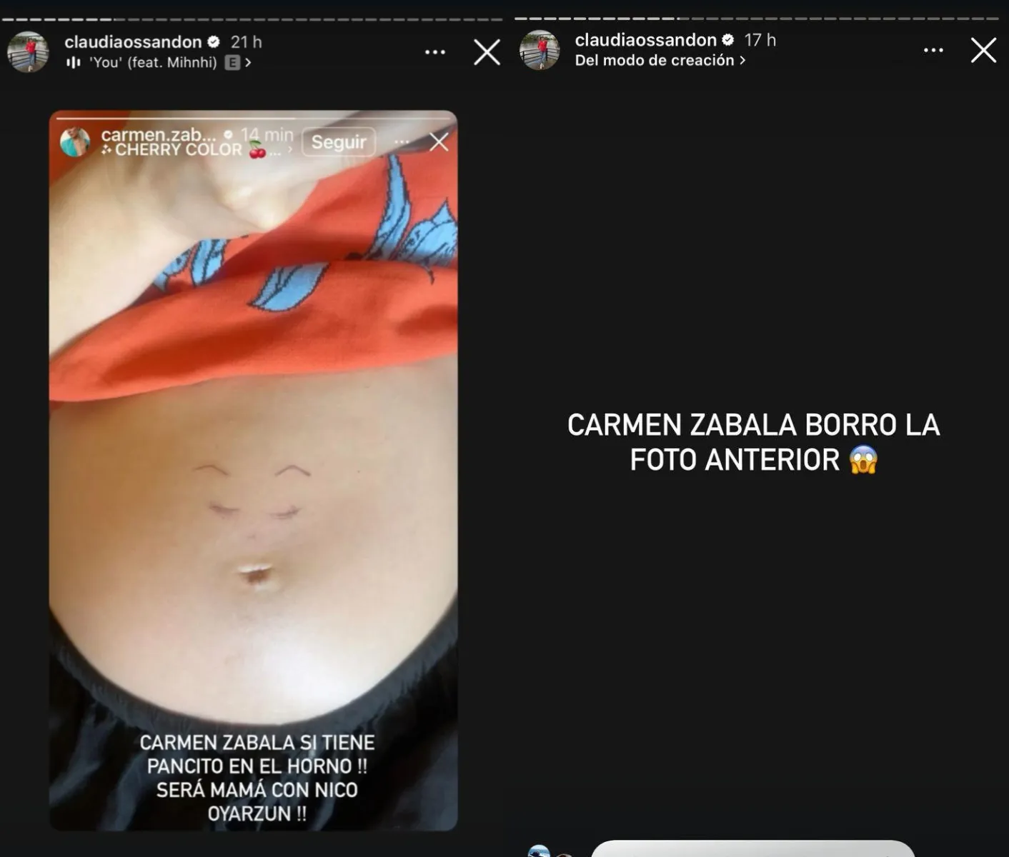 La actriz Carmen Zabala generó rumores de embarazo al publicar una foto en Instagram mostrando su abdomen, junto a su pareja Nicolás Oyarzún. La imagen fue comentada por seguidores y replicada por Claudia Ossandón, aumentando la especulación. La supuesta señal de maternidad fue reforzada al desaparecer la historia poco después. A pesar de la intensidad de los rumores, ni Zabala ni Oyarzún han confirmado o negado la noticia, manteniendo el posible embarazo como un tema de conversación en redes.