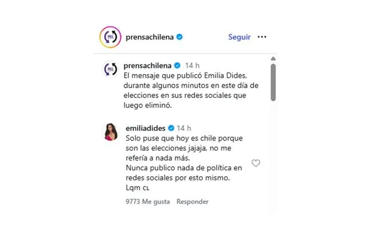 Tras borrar la historia de su perfil, el tema siguió circulando en distintas cuentas de Instagram. Ante esto, Emilia Dides decidió explicar lo ocurrido, dejando un comentario en una publicación de la cuenta @prensachilena.