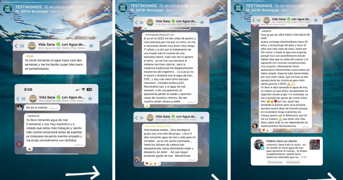 Vendedor afirma que el agua de mar puede curar el cáncer y otras enfermedades a través de su negocio "Sanadictino". Ofrece promoción de 3 botellas por $35.700, con testimonios positivos en redes sociales. Expertos advierten que no hay evidencia científica de sus afirmaciones. El doctor Sergio Castillo señala que la alta salinidad y microorganismos del agua de mar pueden causar complicaciones graves, desmintiendo la creencia de sus supuestos beneficios para la salud, incluido el cáncer.