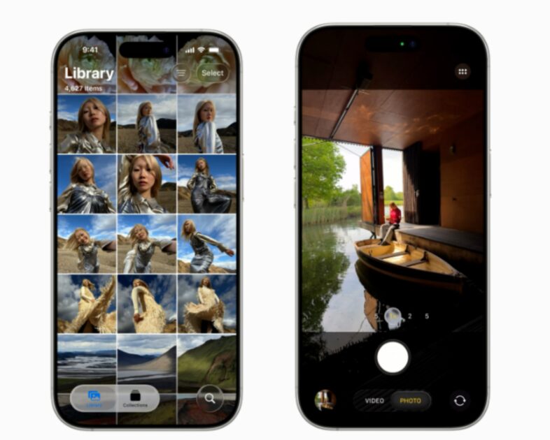 La app de cámara ahora tiene dos controles principales —foto y video— mientras que las funciones avanzadas se despliegan con un clic. En Fotos, se añadieron pestañas separadas para la biblioteca y las colecciones.