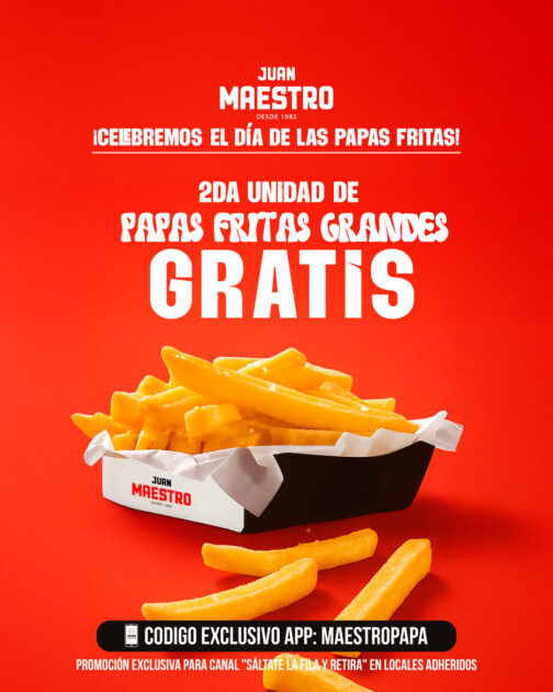 Juan Maestro dispone un 2×1 en papas grandes entre el 18 y 20 de agosto, válido solo a través de su aplicación con el código MAESTROPAPA.