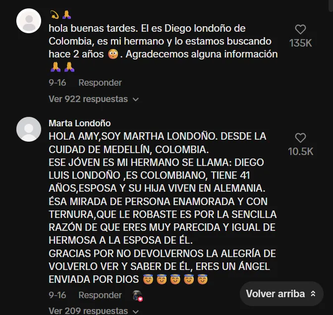 En los mismos comentarios del video, se manifestó otra hermana del hombre desparecido. "Soy Martha Londoño, desde la ciudad de Medellín. Ese joven es mi hermano. Tiene 41 años. Su esposa y su hija viven en Alemania".