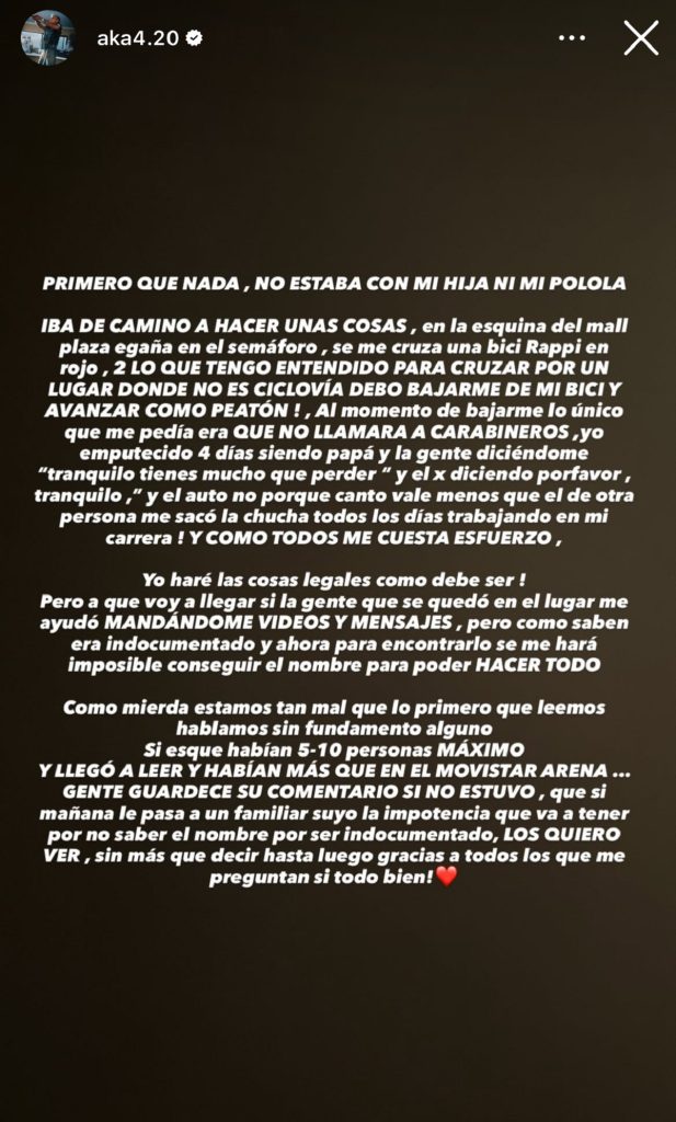En ese contexto, contó que se bajó del vehículo mientras el repartidor le pedía no llamar a Carabineros. “Yo emputecido, cuatro días siendo papá, y la gente diciéndome ‘tranquilo, tienes mucho que perder’“, señaló AK4:20.