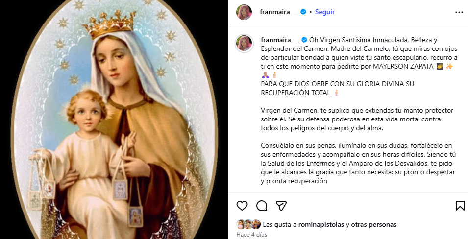 Días atrás había publicado una fotografía de la Virgen del Carmen, también pidiendo oraciones por su bienestar, gesto que recibió múltiples mensajes de apoyo por parte de sus seguidores.