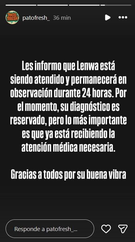 “Ya llegaron a buscarlo, se lo llevaron Carabineros al Padre Hurtado. Se lo llevaron de una, fue super rápido porque no iba bien (…) Para todos los que están preocupados y preocupadas del Lenwa, en estos momentos está en el hospital”, señaló.