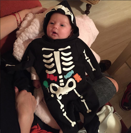 El ex jugador de La Calera compartió una imagen en su cuenta de Instagram donde muestra a Luciana con un enterito negro de esqueleto y con algunos caramelos.