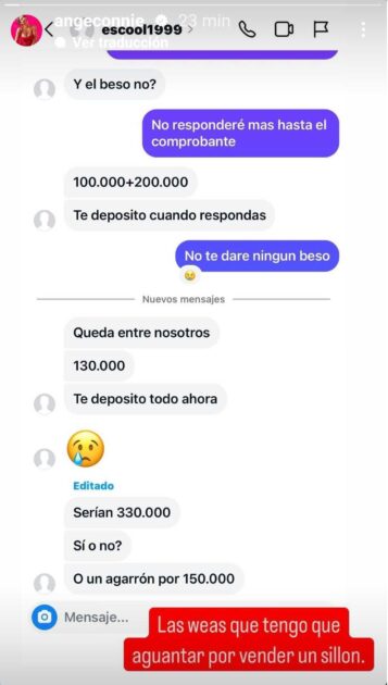 La modelo compartió la conversación en sus historias, este viernes, junto a un sentido mensaje. “Las weás (sic) que tengo que aguantar por vender un sillón”, escribió.