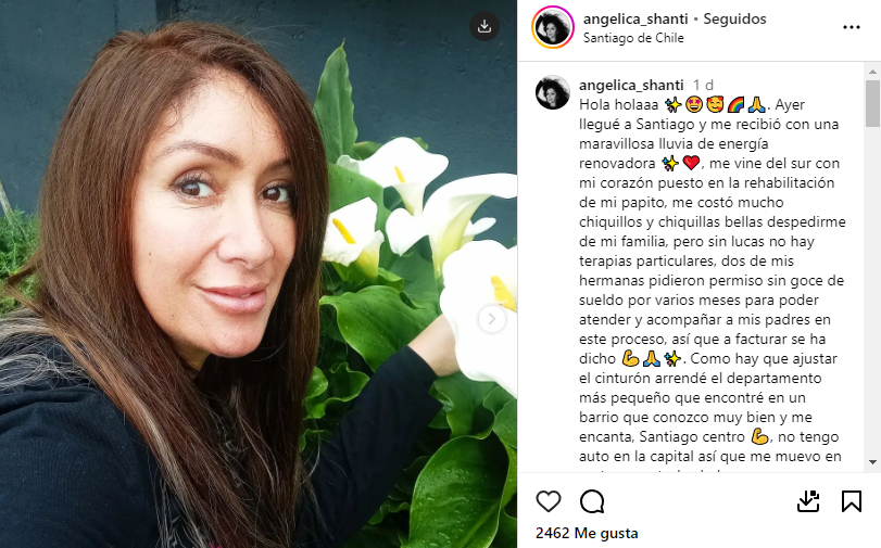 “Llegué a Santiago y me recibió con una maravillosa lluvia de energía renovadora. Me vine del sur con mi corazón puesto en la rehabilitación de mi papito”, partió señalando.