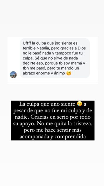 Finalmente, reflexionó en que “la culpa que uno siente, a pesar de que no fue mi culpa y de nadie. Gracias en serio por todo su apoyo. No me quita la tristeza, pero me hace sentir más acompañada y comprendida”, cerró.