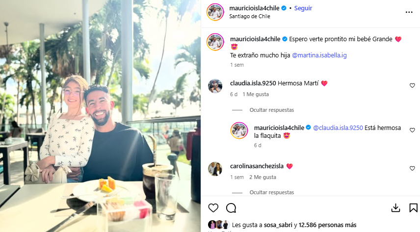De hecho, la última publicación fue el pasado martes 26 de agosto, donde aparece con su primogénita. “Espero verte prontito mi bebé grande. Te extraño mucho, hija”, escribió el ‘Huaso’.