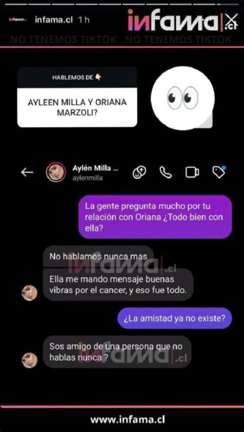 Cuando Infama insistió en saber si la amistad con Oriana Marzoli seguía en pie, Aylén Milla respondió con otra pregunta: “¿Sos amigo de una persona con la que no hablás nunca?”.