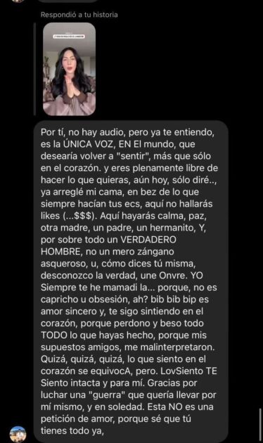 Antes de que el caso tomara más revuelo, la influencer se refirió a ello en su canal de difusión de Instagram, donde se lee: “De verdad estuve evitando hacer cualquier tipo de declaraciones al respecto porque lo he pasado como el pico francamente con esta situación, pero hoy lo subieron como ‘chisme’ a TikTok” (sic).