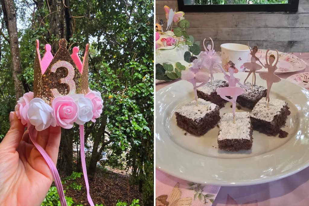 La cumpleañera tuvo una corona de goma eva con flores y el número 3, además de unos deliciosos brownies decorados con bailarinas de ballet.