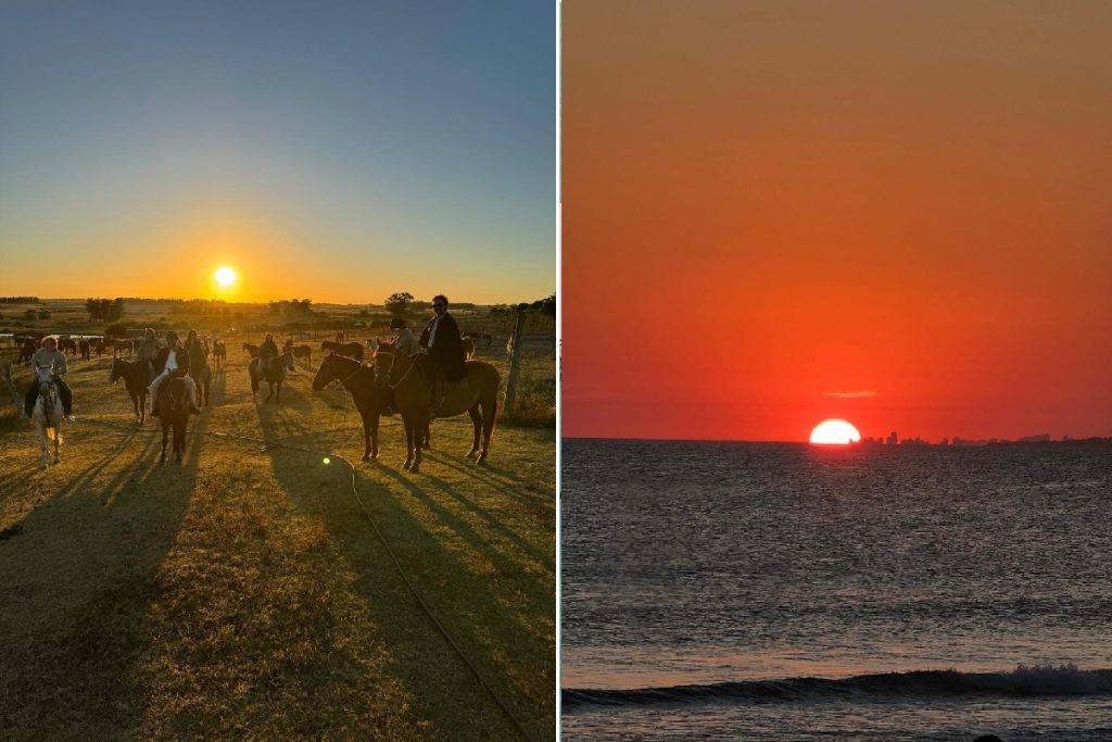 El contacto con el entorno natural fue otro de los sellos del viaje. Una postal los retrató cabalgando al atardecer, con ponchos y sombreros, mientras el sol caía sobre un campo abierto.