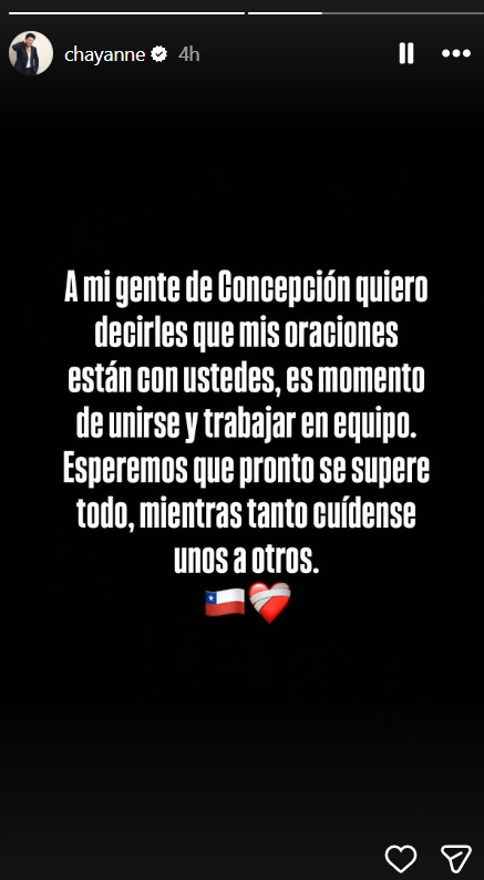 “A mi gente de Concepción quiero decirles que mis oraciones están con ustedes, es momento de unirse y trabajar en equipo”, expresó el cantante.