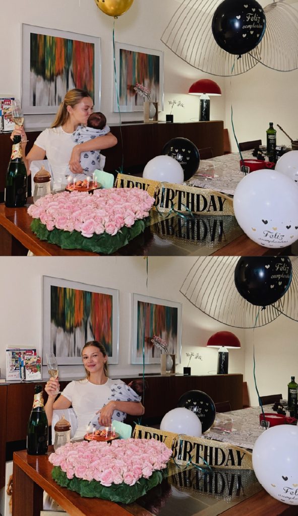 Sin embargo, tras el primer brindis, una persona deja una mamadera sobre la mesa y le entrega a su hija en brazos, momento en que la modelo recibe con una sonrisa directa a la cámara.