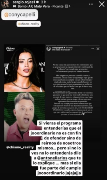 Sergio Rojas no se quedó callado y respondió en sus redes sociales a Cony Capelli. “Si vieras el programa entenderías que el ´jooordinario´ no es con fin de ofender. Sino de reírnos de nosotros mismos, pero si no lo ves no lo entenderías…”, dijo.