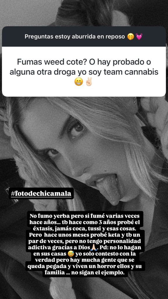 “Pero hace unos meses probé keta, también un par de veces, pero no tengo personalidad adictiva, gracias a Dios”, aclaró. Aún así, recalcó: “PD: No lo hagan en sus casas”.