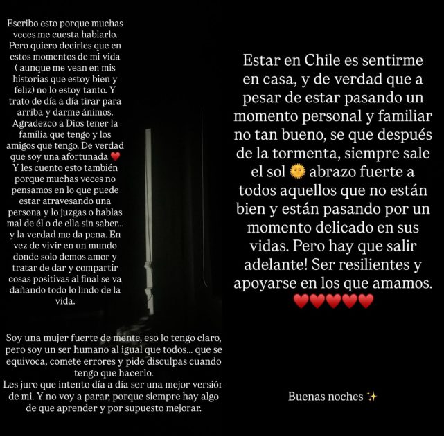 “Quiero decirle que en estos momentos de mi vida, aunque me vean en mis historias que estoy bien y feliz, la verdad no lo estoy tanto. Trato de día a día tirar para arriba y darme ánimos”, partió señalando.