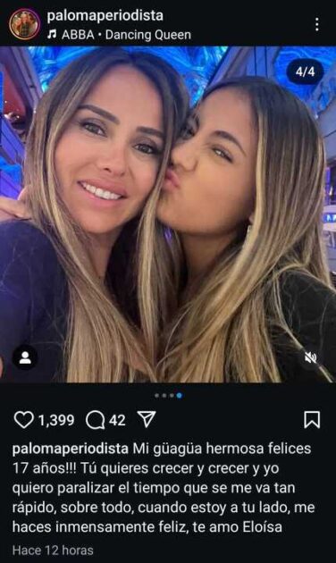 “Mi guagua hermosa, ¡felices 17 años! Tú quieres crecer y crecer y yo quiero paralizar el tiempo, que se me va tan rápido, sobre todo cuando estoy a tu lado”, escribió Paloma a su hija.