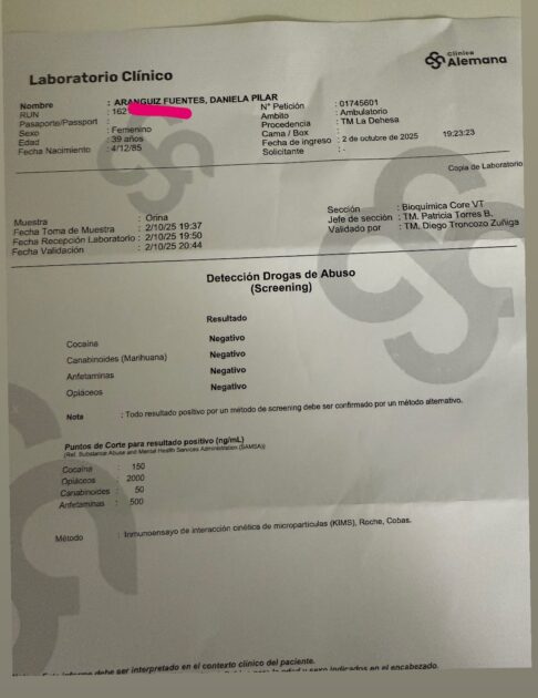 Daniela Aránguiz utilizó su cuenta de Instagram para mostrar los resultados de un examen de drogas que se realizó en las últimas horas.