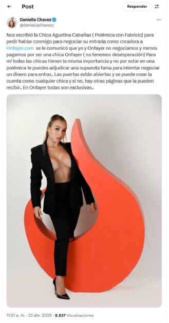 Ahora, fue Daniella Chávez quien la echó al agua a través de X (Twitter), donde aseguró que la modelo quiso lucrar negociando su ingreso a la plataforma de contenido para adultos que ella lidera.