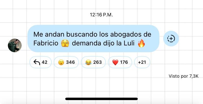 “Me andan buscando los abogados de Fabricio… Demanda, dijo la Luli”, bromeó al respecto.